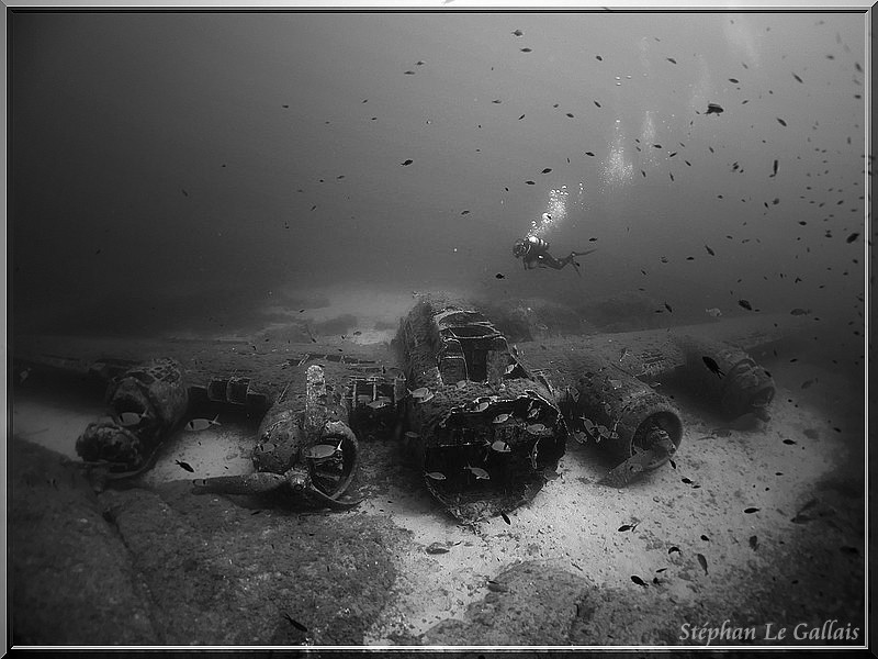 DIVING SITE The wreck is still very well preserved and a popular diving destination. The wings are almost intact and the four engines are visible. Unfortunately, most of the propeller blades were removed. The nose was destroyed by the impact. The cockpit with its two metal seats and the intervening instruments are still quite well preserved. A little further away are the remains of the stern and a tail wheel.
