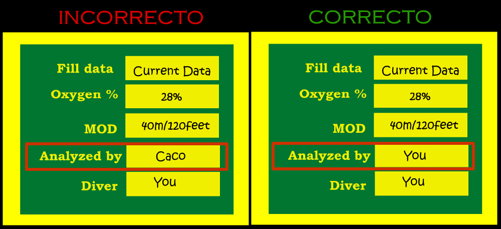 - El nombre de quien analizó la mezcla, que debe ser el mismo buceador que va a usarla. Esto es de vital importancia y nunca deberemos confiar esa tarea a otra persona. En el caso de que no tuviéramos acceso al analizar por cualquier motivo, debemos estar como mínimo presentes cuando un tercero analiza nuestra botella y estar de acuerdo con la medición efectuada por él, para nuestra propia seguridad.